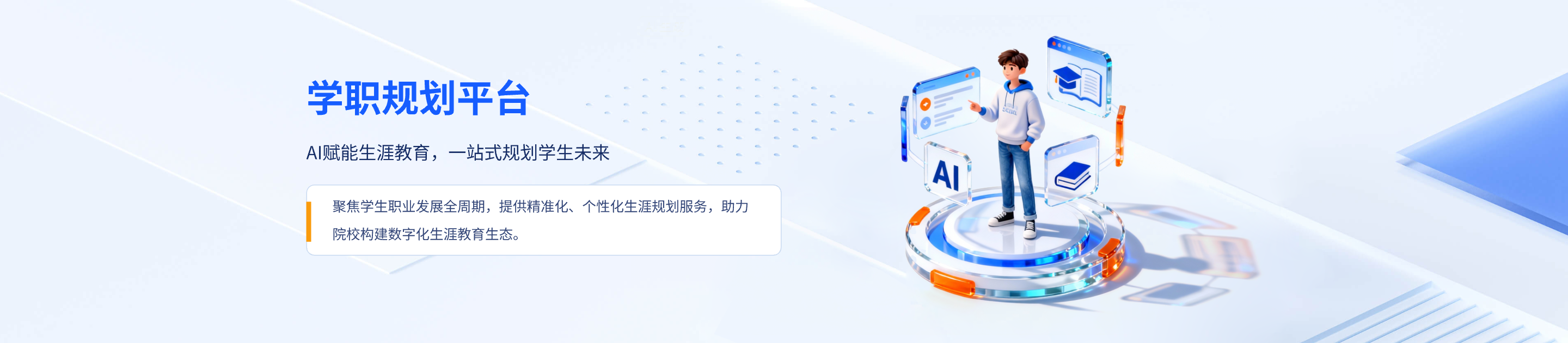 以AI技术为驱动,整合学生成长全周期数据(自我认知→职业探索→生涯决策→动态规划),为院校构建“精准化生涯辅导+数据化教育管理”平台,赋能学生职业发展、教师高效指导、学校科学决策。