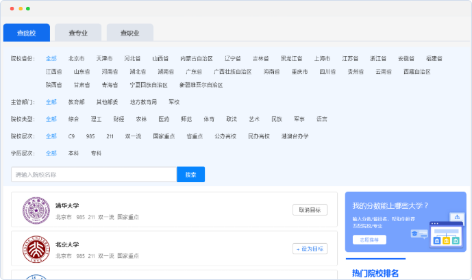 一键查询全国2900+高校全量数据库、800+本科专科专业详情、1500+人社部备案职业档案。