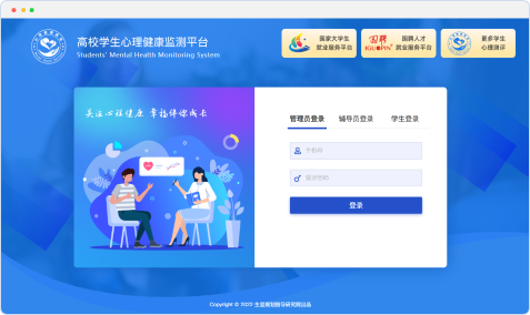 高校学生心理健康监测系统是专为高校学生设计的心理健康测评平台,以权威心理健康监测量表为核心,结合多套专业测评工具。通过阶段性发展主题分析及多维评估指标,科学筛查心理风险,实现精准分类管理与“一生一策”,全面把握学生心理状态。