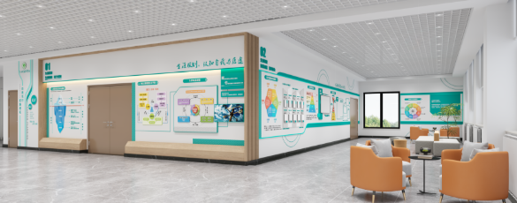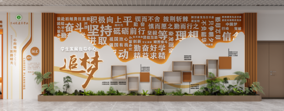 以双廊设计贯穿整个中心,联动各功能场馆形成一体化展示空间。配备生涯挂图、时光长廊、学职探索自助仪、高校智能展播系统等设备,融合校园文化与生涯教育内容,通过视觉化、沉浸式设计,强化学生对生涯规划的认知与重视,成为中心的“文化中枢”。
